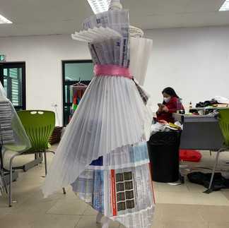 For the base of the garment, we designed a corset to strengthen the core of the garment using plastic ropes to tie around the waist like a belt. Then we taped it after tying the corset to make sure it doesn't loosen up.